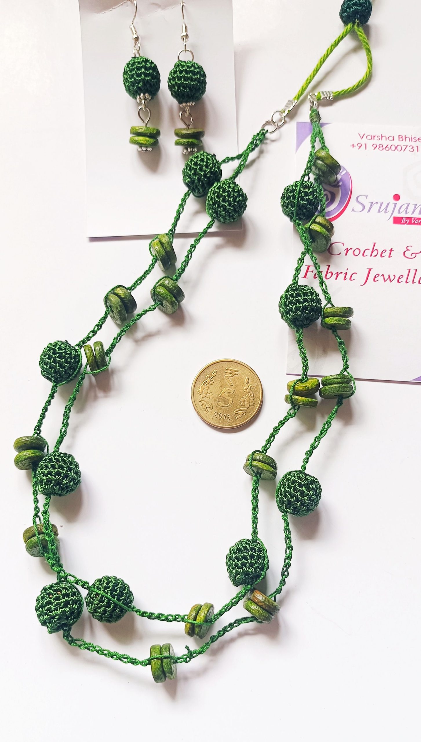 Necklace and earrings set with crochet beads and wooden beads, strung in a crochet chain. Earrings type: Hook Coin is for size purpose.
